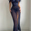 El vestido "Sapphire" eleva la lencería a otro nivel. Confeccionado en un tul (mesh) semitransparente de color azul profundo, este diseño envuelve tu cuerpo creando una silueta estatuesca y seductora.